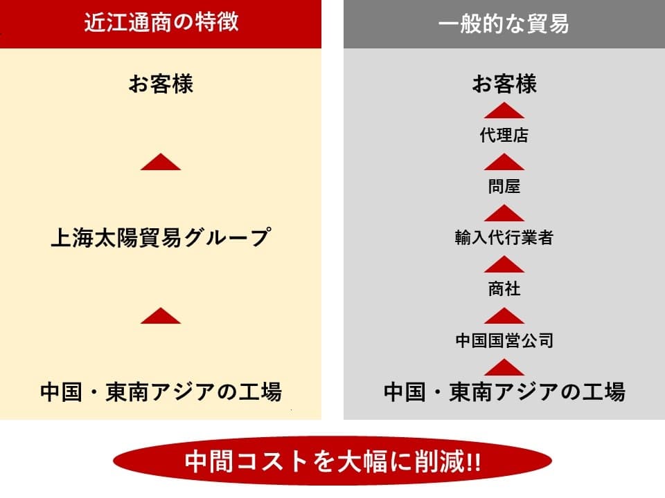 近江通商が束ねる上海太陽貿易グループは、2,000年2月に日本と中国で貿易を営むものがネットワークを組み、役割分担をしながら協同で貿易を行っている企業体です。複雑な流通過程を省き、コストダウンを図りながら21世紀に求められる環境・エコ商品を日本のお客様に直接お届けしています。「竹炭・竹酢液・オガ炭のOEM生産やオリジナル商品開発」が得意分野です。